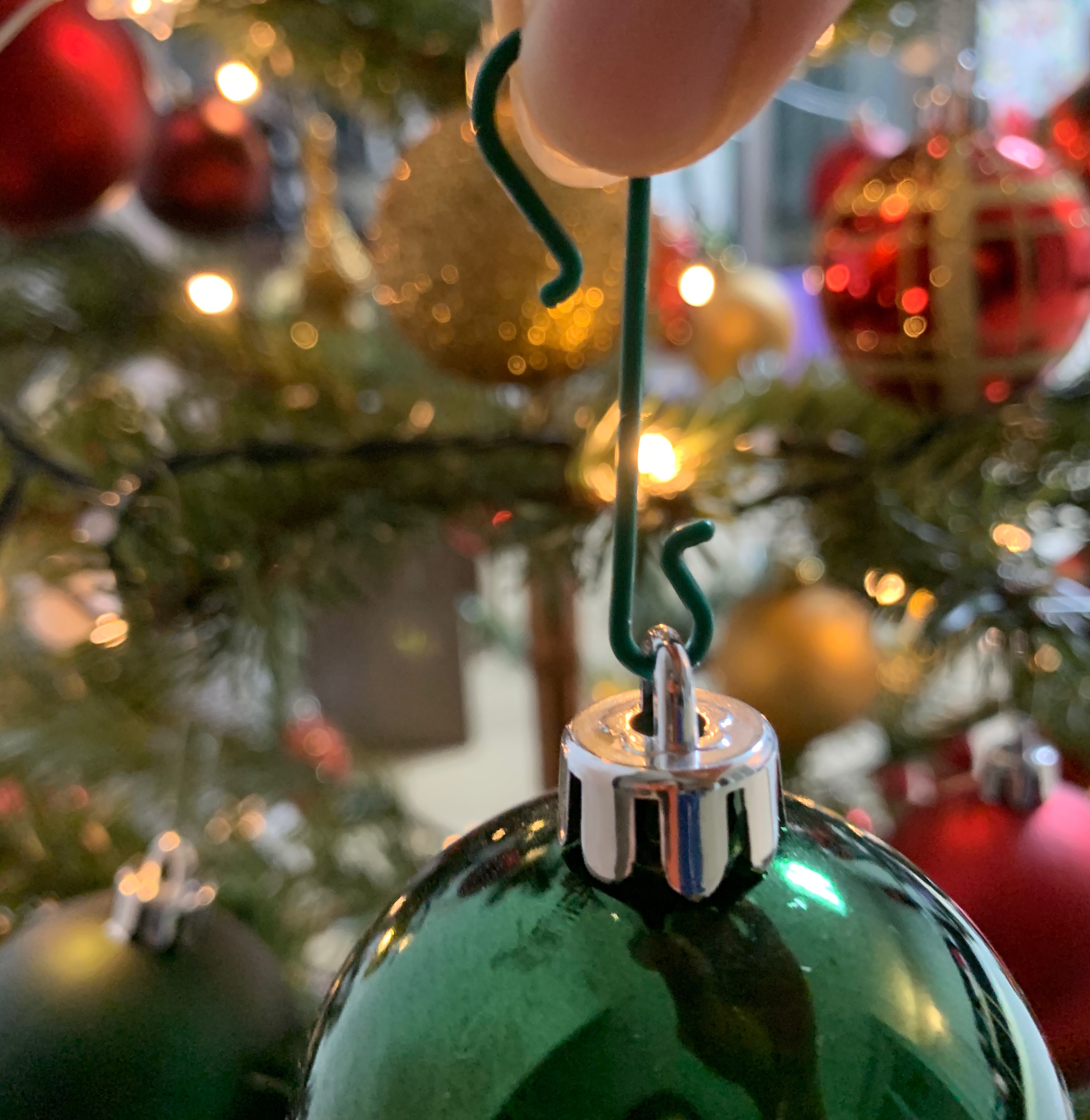 크리스마스 장식품들은 이렇게 고리에 투명한 줄을 연결하거나 초록색 고리를 연결해서 나무에 걸 수 있도록 되어있어요.