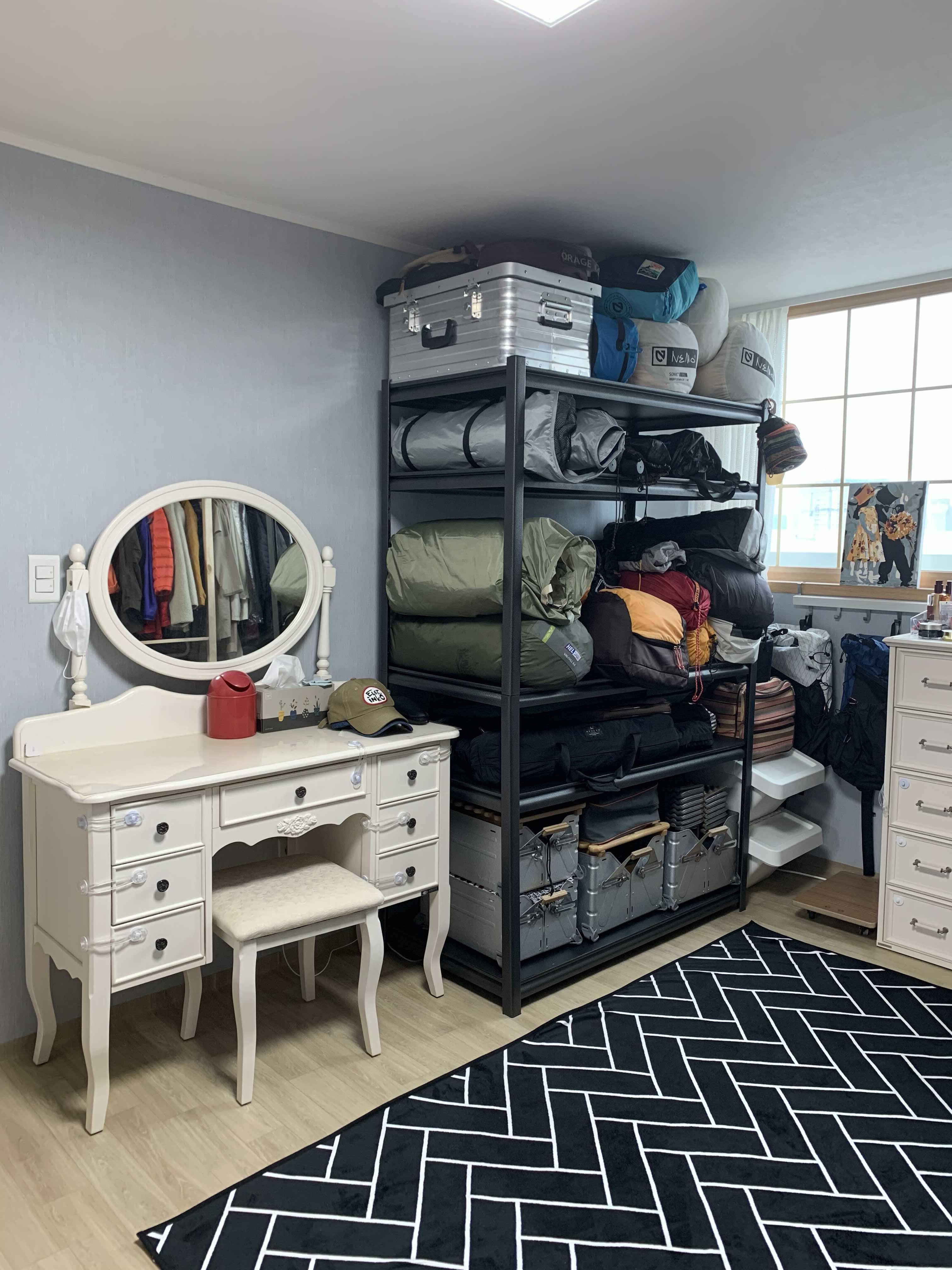 가운데 서랍을 중심으로 오른쪽엔 행거와 선반을, 왼쪽에는 캠핑장비와 화장대를 넣었어요.