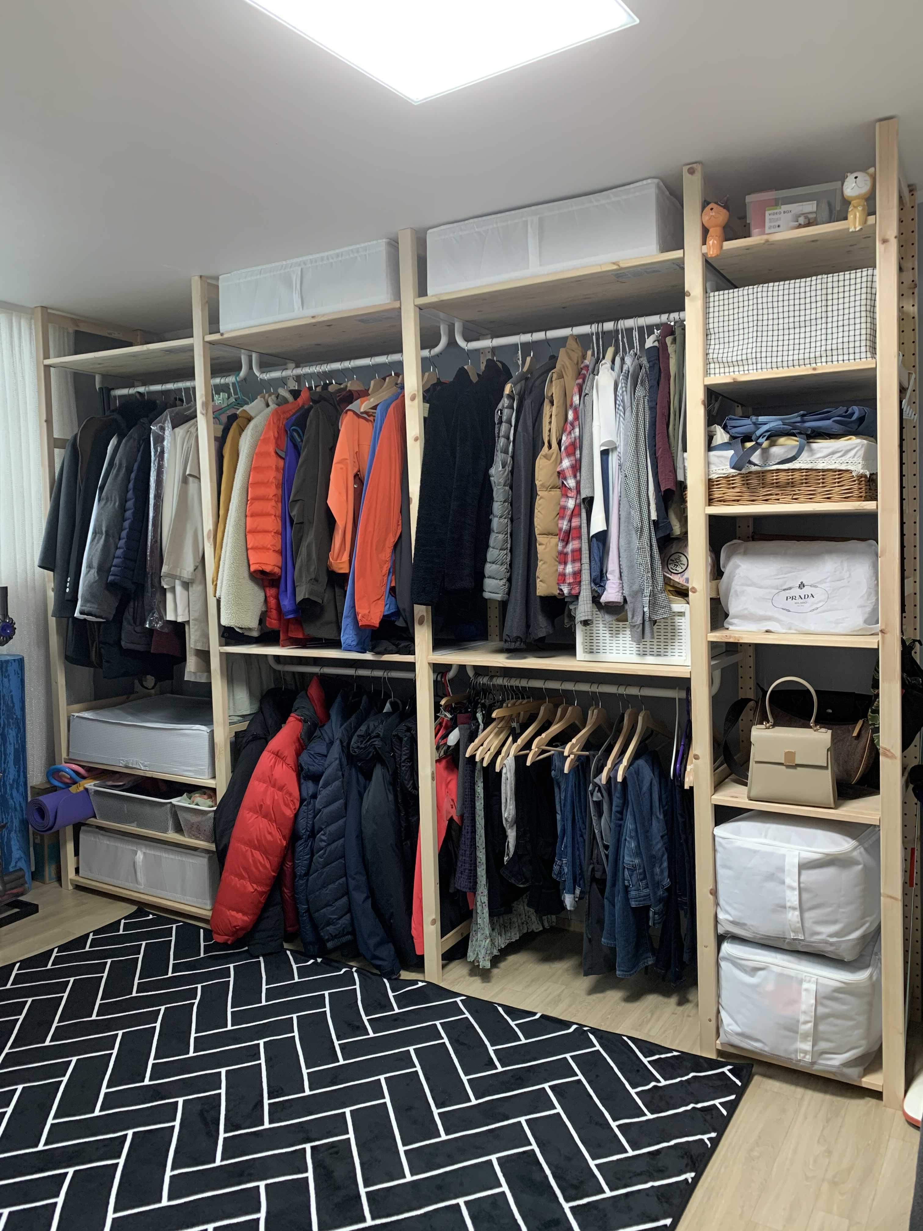 그동안 일반 행거를 썼었는데 조금 더 깔끔하게 시스템 행거처럼 선반을 넣었어요. 옷 방 완성의 1등 공신인듯합니다.