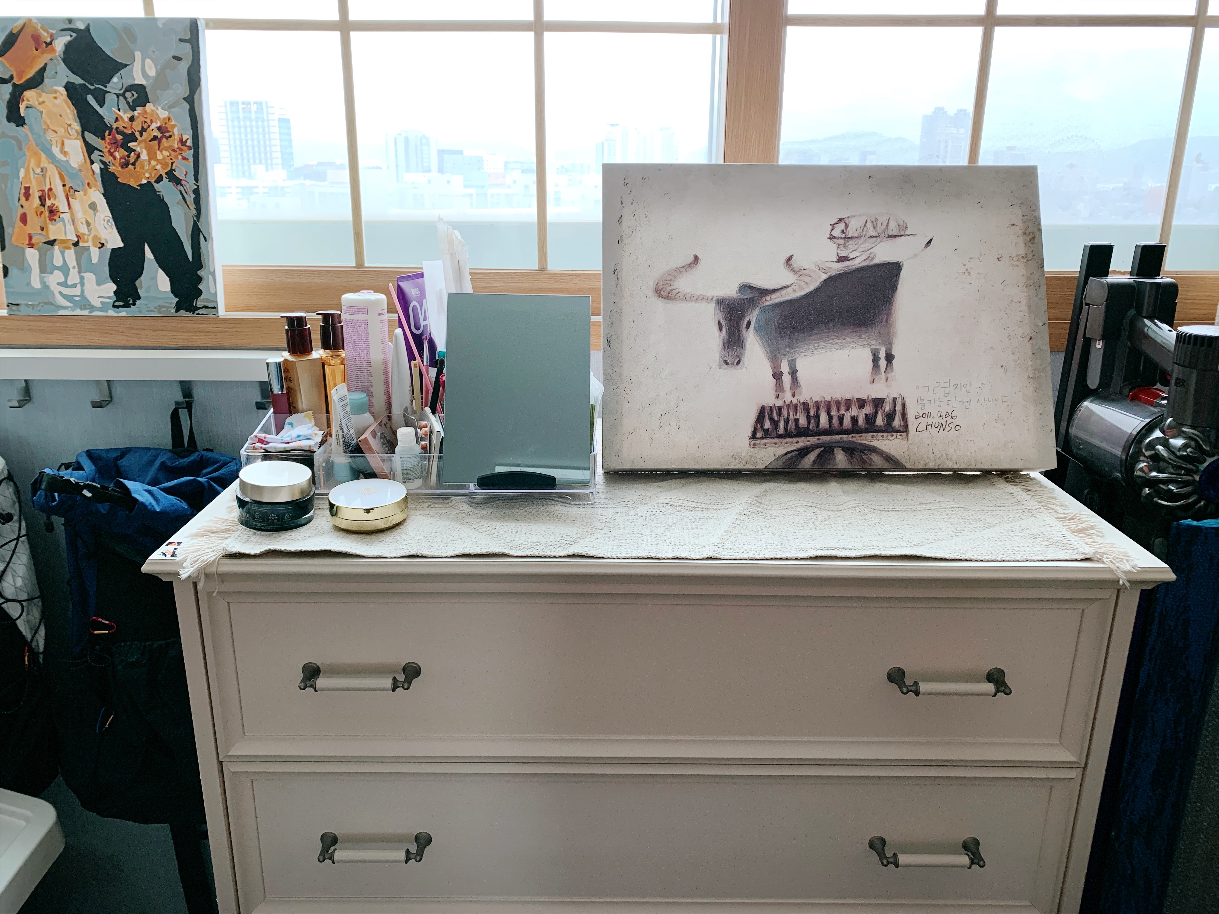 서랍장 위에는 화장품과 남편이 좋아하는 그림을 올려두었어요. 그림만 올려두고 싶었는데 아이가 화장품을 자꾸 만져서 높은 곳으로 이동할 수밖에 없었어요.